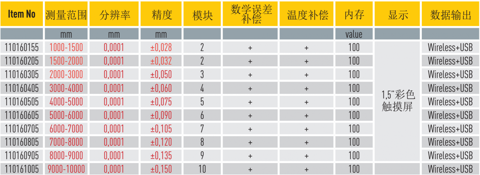 ? 數(shù)顯分辨率 0,0001mm? 針對(duì)大的部件細(xì)節(jié)測(cè)量達(dá)到 10000 mm? 模塊化的設(shè)計(jì) (達(dá)到 2100mm) 大于1000mm 千分尺組成元素為2-8? 為Windows PC 或 Android 設(shè)備無線傳輸數(shù)據(jù) (可選)